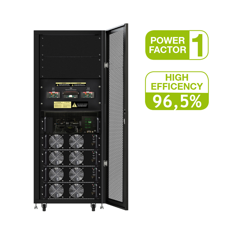 Armario UPS EVO DSP MODULAR HE 30U capaz de acomodar hasta 4 módulos UPS TT 20KVA (se debe pedir por separado) equipados con derivación estática de 80KVA (STS), interruptor de derivación manual, conexiones / seccionadores de entrada / salida, conexión y seccionador para baterías externas, pantalla táctil LCD de 10 «, puertos de comunicación RS-232, USB, EPO y ranura inteligente para instalar el SNMP, RS485 o tarjeta de contacto seco, software TecnoManager (descargable de forma gratuita desde www.tecnoware.com) Cierre con puerta de rejilla frontal y puerta trasera, paneles laterales extraíbles Dimensiones 60×110 cm con altura 147.5cm peso 197Kg.