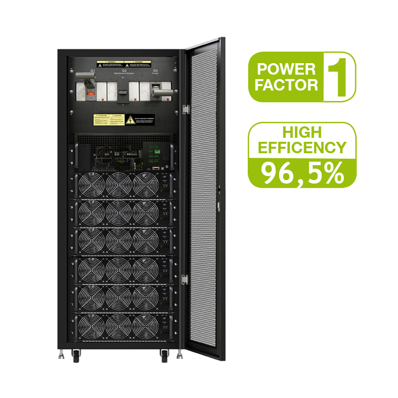 Armario UPS EVO DSP MODULAR HE 30U capaz de acomodar hasta 6 módulos UPS TT 20KVA o 30KVA (se deben pedir por separado) equipados con derivación estática de 180KVA (STS), interruptor de derivación manual, conexiones/seccionadores de entrada/salida, conexión y seccionador para baterías externas, pantalla táctil LCD de 10 «, puertos de comunicación RS-232, USB, EPO y ranura inteligente para la instalación de SNMP, RS485 o tarjeta de contacto seco, software TecnoManager (descargable de forma gratuita desde www.tecnoware.com). Cierre con puerta de rejilla delantera y puerta trasera, paneles laterales extraíbles. Dimensiones 60×110 cm con altura 147.5cm peso 230Kg.