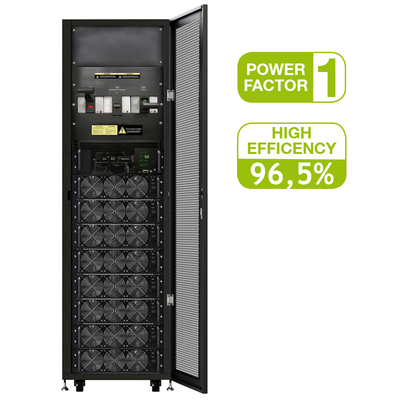 Armario UPS EVO DSP MODULAR HE 42U capaz de acomodar hasta 8 módulos UPS TT 20KVA o 30KVA (se debe pedir por separado; en el caso de módulos de 30KVA, máximo 8 módulos pero uno redundante) equipado con un bypass estático (STS) de 210KVA, interruptor derivación manual, conexiones y seccionadores de entrada / salida, conexión y seccionador para baterías externas, pantalla táctil LCD de 10 «, puertos de comunicación RS-232, USB, EPO y ranura inteligente para instalar el SNMP, RS485 o tarjeta de contacto seco, Software TecnoManager (descargable de forma gratuita desde www.tecnoware.com). Cierre con puerta de rejilla frontal y puerta trasera, paneles laterales extraíbles. Dimensiones 60×110 cm con altura 201cm peso 273Kg.