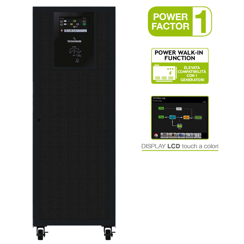 Sistema de Alimentación Ininterrumpida UPS EVO DSP PLUS TT 120.0 – Potencia 120 KVA PF 1. DSP de tecnología On Line (VFI) con estructura modular, eficiencia 96%, entrada / salida 400Vac, 50 / 60Hz, dimensiones 43x120x100 cm, peso 200 Kg, Módulos internos Easy Swap con función redundante, Power Walk-In al arrancar el rectificador, no contiene baterías, autonomía de extensión a través de cajas de baterías adicionales. Pantalla LCD de 10 «Pantalla táctil gráfica multifunción, derivación estática y manual, contacto EPO para apagado de emergencia, puertos de comunicación USB y RS232 para control de UPS y programación de encendido / apagado a través del software gratuito TecnoManager. Tarjeta SNMP, contacto seco o MODBUS (opcional).