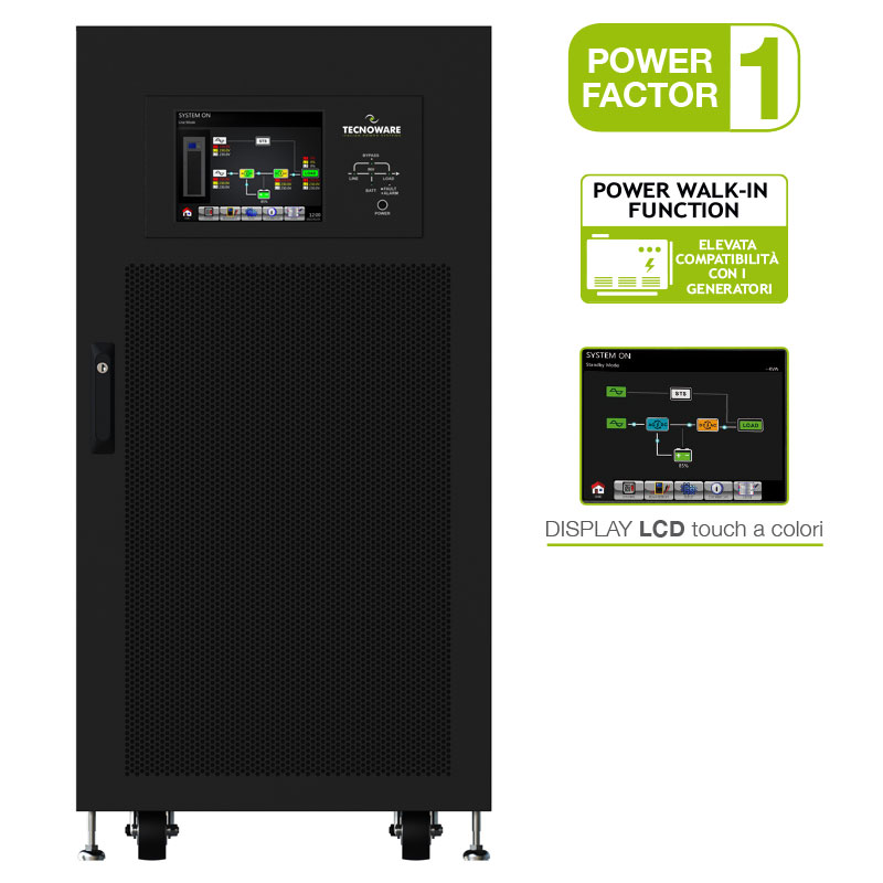 SAI EVO DSP PLUS TT 300.0 – Potencia 300 KVA PF 1. On Line Technology (VFI) DSP con estructura Modular, Eficiencia 96%, Entrada/Salida 400Vac, 50/60Hz, dimensiones 60×147,7×110 cm, peso 396 Kg, Módulos internos Easy Swap con función redundante, Power Walk-In al arrancar el rectificador, no contiene baterías, Ampliación de la autonomía mediante cajas de baterías adicionales. 10″ Display LCD Multifunción gráfica táctil, bypass estático y manual, contacto EPO para parada de emergencia, puertos de comunicación USB y RS232 para control del SAI y programación on/off a través del software gratuito TecnoManager. Tarjeta SNMP, Dry Contact o MODBUS (opcional).